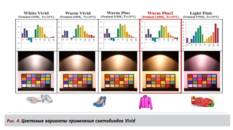 White Vivid идеально подойдет для освещения бриллиантов, часов, блестящих поверхностей, комнат для чтения, рекламных билбордов и т.д. Warm Vivid подходит для освещения магазинов одежды, фруктовых витрин, интерьерного освещения, дизайнерских проектов, поскольку создает приятную атмосферу и повышает контрастность объектов. Warm Plus так же, как и вся серия Vivid, придает контрастность освещаемым объектам, создавая более теплую и приятную атмосферу. Применяется это освещение в кафе, булочных, в прилавках магазинов. Для создания еще более теплой атмосферы разработана серия Vivid Warm Plus Plus. Серия Light Pink специально произведена для освещения мясной и рыбной продукции. Ее важным отличием является не только насыщенность красного цвета, но и подчеркивание белого в жилах и прослойках мяса, благодаря чему продукты выглядят свежими и имеют отличный товарный вид. Цветовые варианты применения светодиодов Vivid иллюстрирует рис. 4.